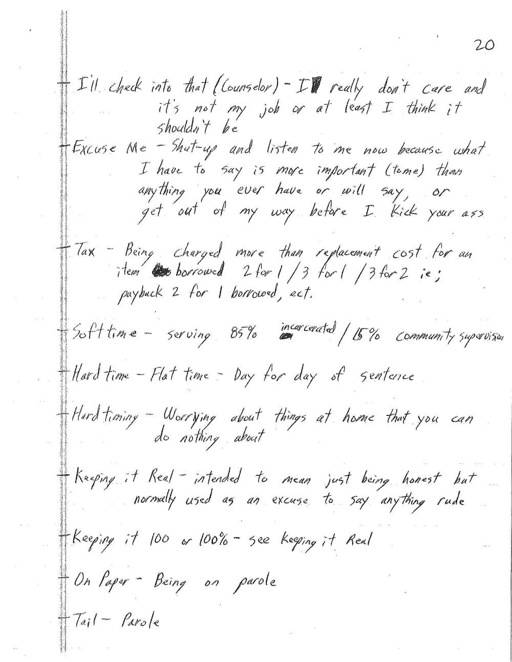 The following are terms you may come across from time to time in this blog. They are not all words I would use, and actually, some I would never say out loud. A few I don’t even like saying in my mind, although I must admit I do have some songs on my phone by artists who use them. These are words that inmates use, words that Craig used and encountered on a near-daily basis while locked up.