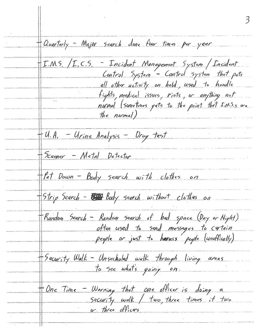 It really surprised me the first time I read through this list. His letter had come in the mail and I let the fat envelope sit on the printer in my office for at least a week before I opened it. I assumed I knew what it was, but really, when I looked at it, it was overpowering. The thought that went into cultivating the words, 20 pages worth of the meaning of what he lived through, that was kind of a strong kick to the pants to me like, “Hey, he really means it when he says he wants to talk about what he went through, what the prison system was really like for him.”
