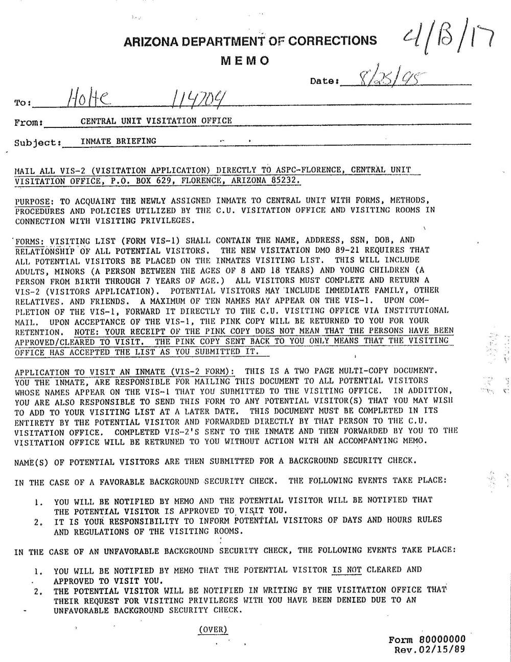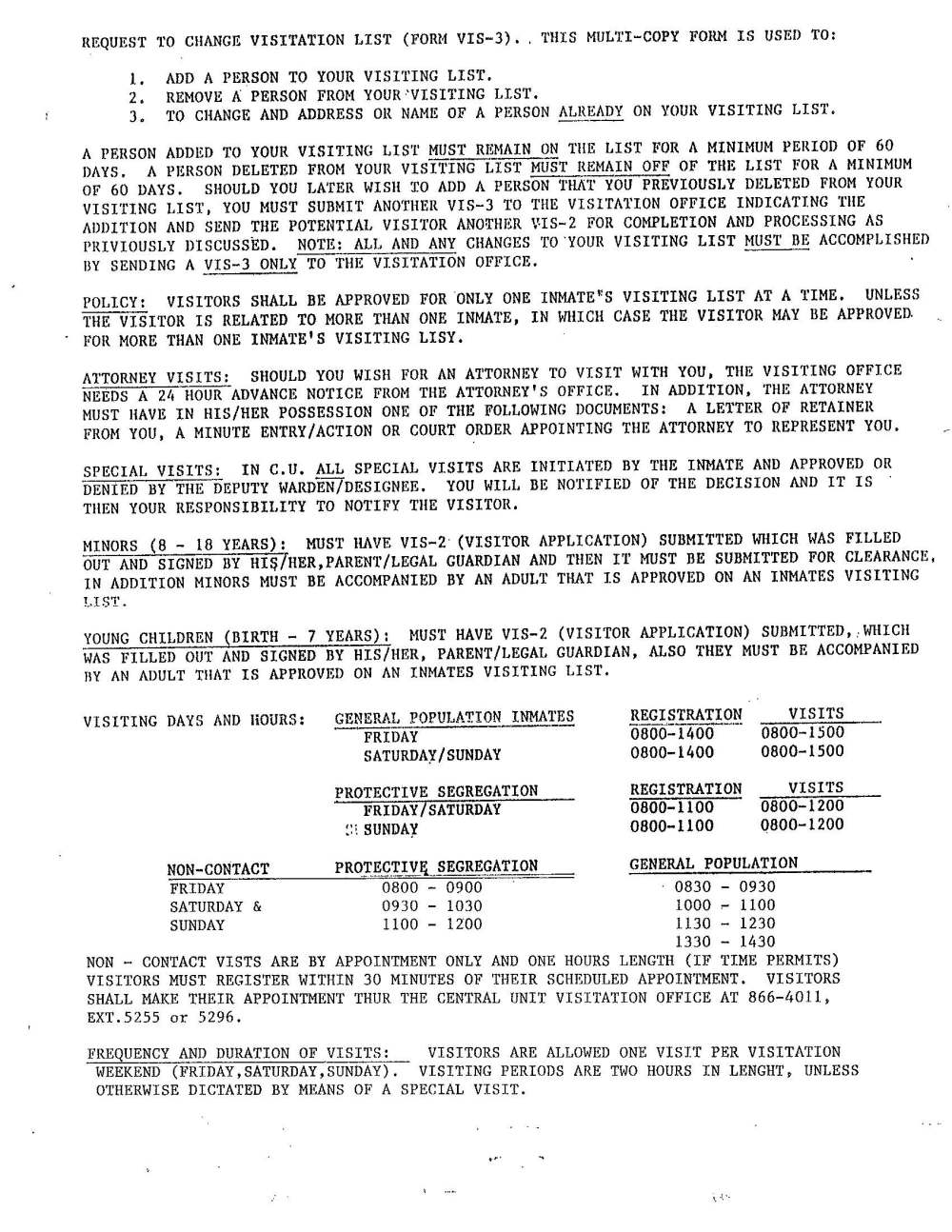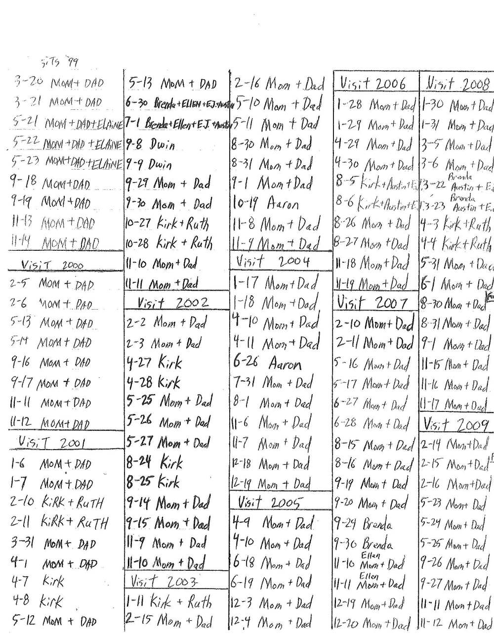 Before anyone could go see Craig, they had to be on his visitation list. The rules were extensive, even for the visitors. Throughout the years, Craig kept track of all the visits he received, mostly from his parents but also from other family members and friends.